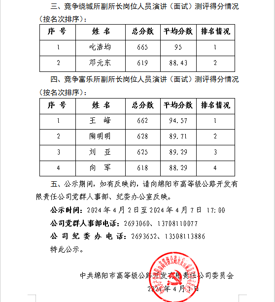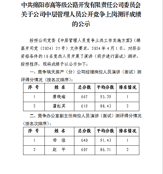 關(guān)于公司中層管理人員公開競爭上崗測評成績的公示